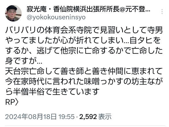ただ願人坊主というのは明治に禁止されているので意味が通じないので修験者と言うのが一番いいのかもしれませんね。大学に入るのに確認してもらったら天台宗修験道法流の末席に籍は有るそうですし。