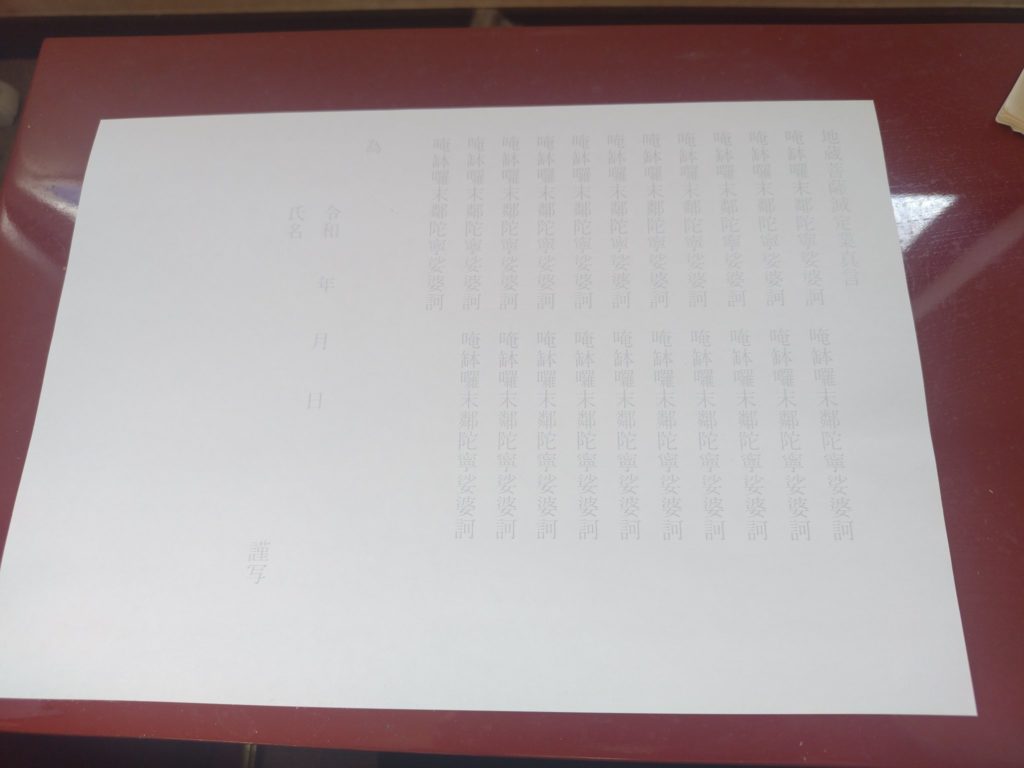 オリジナル写経用紙作成しました、ボールペンで21遍の真言がなぞり書きします。