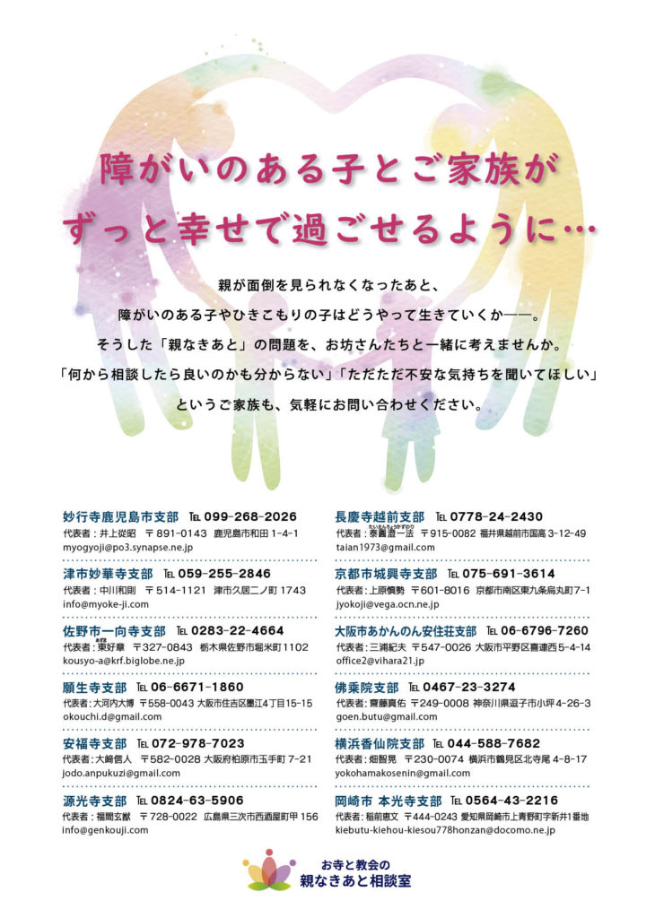 2月19日13時半から横浜市鶴見区菅沢町の天台宗龍澤山宝泉寺地下ホールにて親なきあと語らいカフェを開催いたします。
